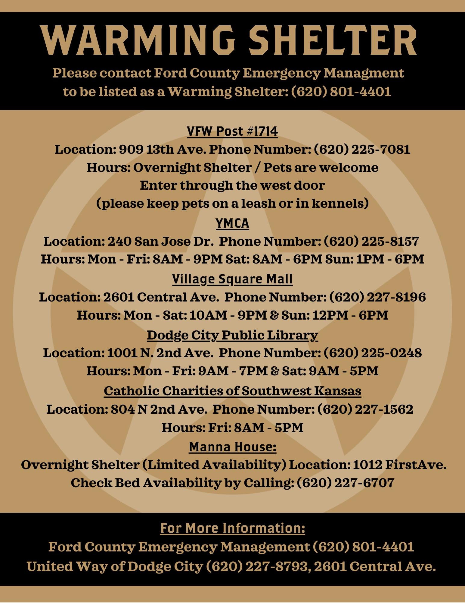 Warming Shelters: See the locations of available warming shelters in Dodge City on the list below.